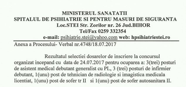 Rezultatul selectiei dosarelor de inscriere la concursul organizat incepand cu data de 24.07.2017 pentru ocuparea a: 3(trei) posturi de asistent medical debutant generalîst cu PL, 3 (trei) posturi de infirmier debutant, l(unu) post de tehnician de radiologie si imagistica medicala licentiat, l(unu) post de sofer tr II si l(unu) post de sofer autosanitara II.