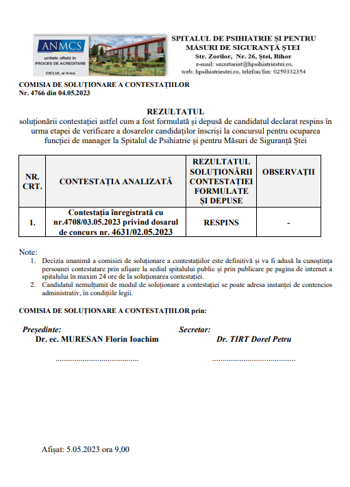 Administrator Ultimele articole 05 May 2023 Hits: 2120 Rezultat contestatie selectie dosare Print Email User Rating: 0 / 5 Please Rate Vote 1 Vote 2 Vote 3 Vote 4 Vote 5 Prev Next