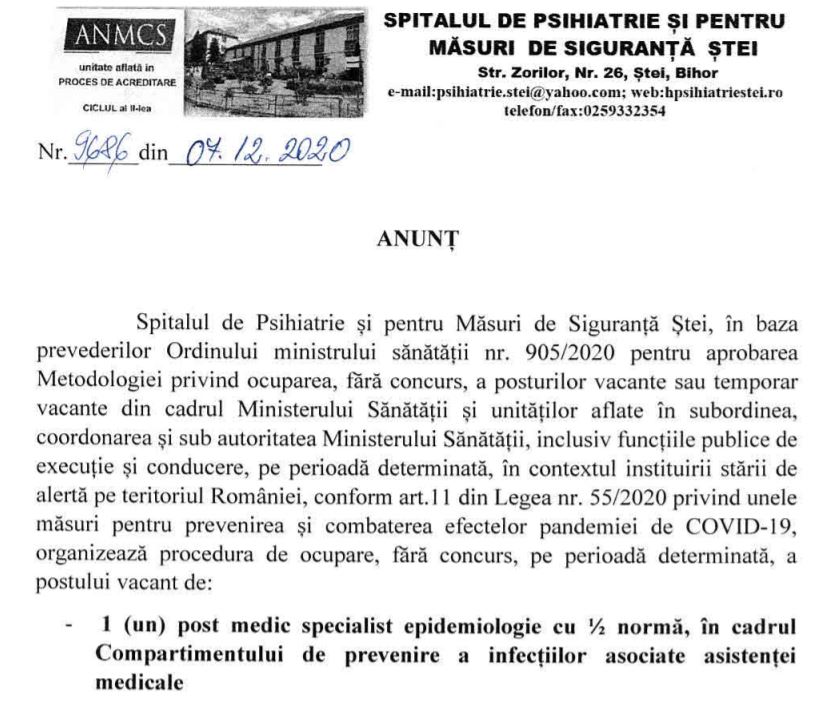 Administrator Ultimele articole 07 Decembrie 2020 Accesări: 3647 Anunt ocupare post medic fara concurs Tipărire Email Evaluare utilizator: 5 / 5 Vă rugăm să evaluați Vot 1 Vot 2 Vot 3 Vot 4 Vot 5 Anunt ocupare post medic fara concurs Prec Următor